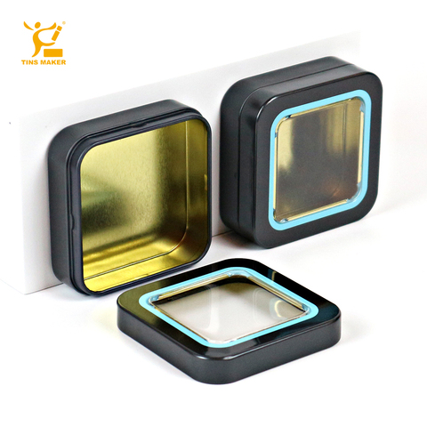 Tinsmaker, Заводская печать на заказ, металлические банки с окном, маленькая черная золотистая квадратная жестяная коробка с прозрачной крышкой